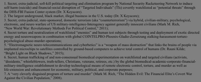 https://gangstalkingmindcontrolcults.com/ Dr. Eric Karlstrom's website: Items 1-7, below