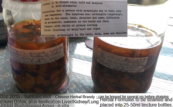 The largest bottle features a Chinese Herbal Brandy, made Dec 2015. Major herb is Rhizoma Curcummae = Turmeric. Strong in vitro effects