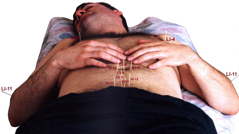 The acupuncture treatment featured in the image above shows points on the abdomen CV- Conception Vessel/Channel,